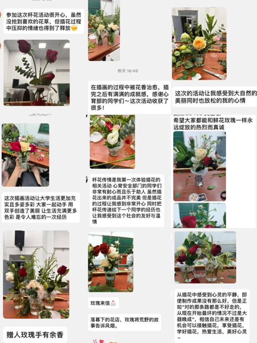 随后,工作人员为同学们发放了花材、花杯及装饰物品。同学们充分发挥自己的创意,将一朵朵鲜花、一片片绿叶巧妙地组合在一起,创作出独具特色的杯花作品。活动现场,欢声笑语不断,同学们沉浸在插花的乐趣中。