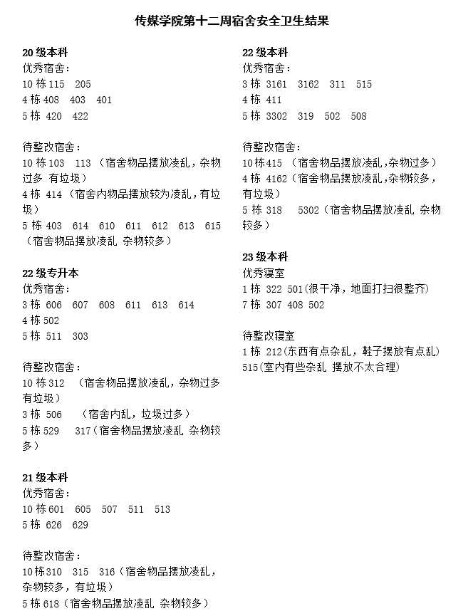 辅导员们在查寝过程中提醒同学们注意用水用电安全,再次强调了公司本科教育评估期间的纪律要求,同时关心同学们的学习计划和学习态度。beats365官方网站本周查寝结果公示如下:
