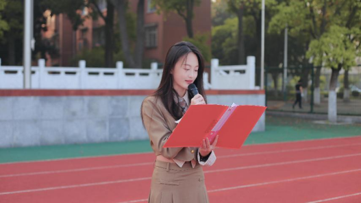 接着,来自播音32301班的夏灿同学以《“热辣滚烫”正当时,“飞驰人生”新征程》为主题进行国旗下讲话。她提到,作为青年一代,我们应该自觉担起肩上的千钧责任,用实际行动点燃心中的激情与斗志,追逐梦想,用勤奋和汗水创造美好的未来。