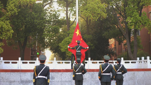 早上7时,升旗仪式正式开始。国旗护卫队护送五星红旗至主席台前,缓缓升起,全体肃立,行注目礼,奏唱国歌。