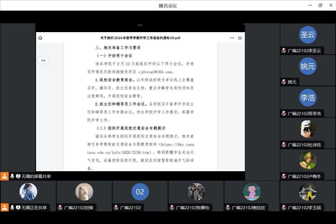 为确保公司2024年春季学期开学和员工返校工作平稳有序开展,公司于2月20日-23日分别组织召开了班主任和辅导员工作专题会议以及全体员工返校安全教育班会。