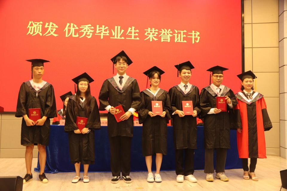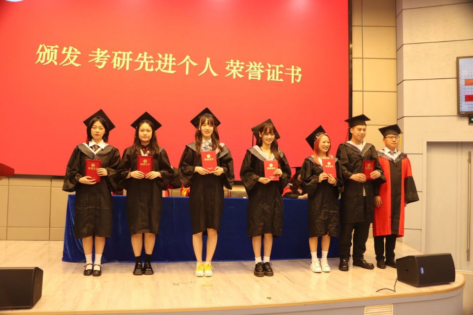 紧接着,进行典礼第二项,宣读学位授予决定和优秀毕业生表彰决定。今年优秀毕业生共57人,考研取国内外优秀公司共30人。由党总支副书记魏红洁为优秀毕业生们颁发证书、常务副经理郑瑞丰为考研先进个人颁发荣誉证书。在祝贺同学们取得荣誉的同时,也祝愿大家能够在今后的征程中珍惜荣誉,再创佳绩。