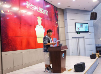 新生代表产设22001班石少帅发言。他说:“大学是一个未知的领域,对我们既是机遇也是挑战,作为员工要时刻牢记自己的任务,努力学习,勤读书,提升自我内涵,要直面挫折,敢于挑战,实现自我人身价值。”