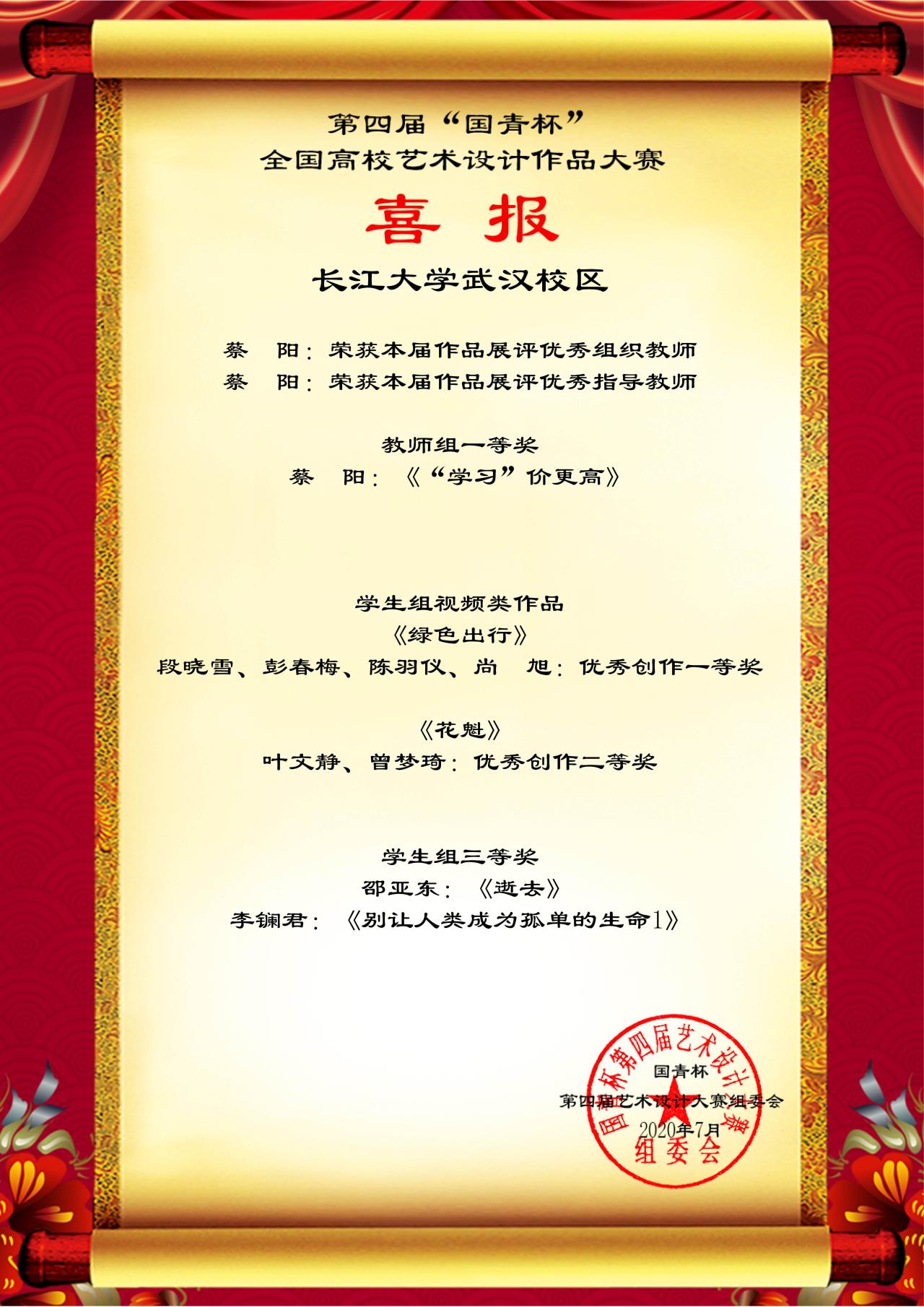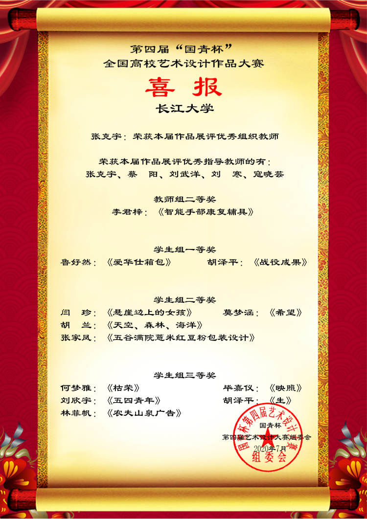 艺术与beats365官方网站为了推动内涵式发展,秉着“以赛促教、以赛促学”的主旨,积极组织参加第四届“国青杯”艺术设计大赛。赛前,公司积极准备,老师们认真指导,师生们专心创作,最后经过遴选,将优秀作品推送大赛评审。日前,公司接到“国青杯”喜报,本次共获员工组一等奖3名、二等奖5名、三等奖7名的好成绩,蔡阳老师获得教师组一等奖,李君梓老师获得教师组二等奖,蔡阳、张克宇老师荣获本届作品展评优秀组织教师,张克宇、蔡阳、刘武洋、刘寒、寇晓芸老师获得本届作品展评优秀指导教师奖。