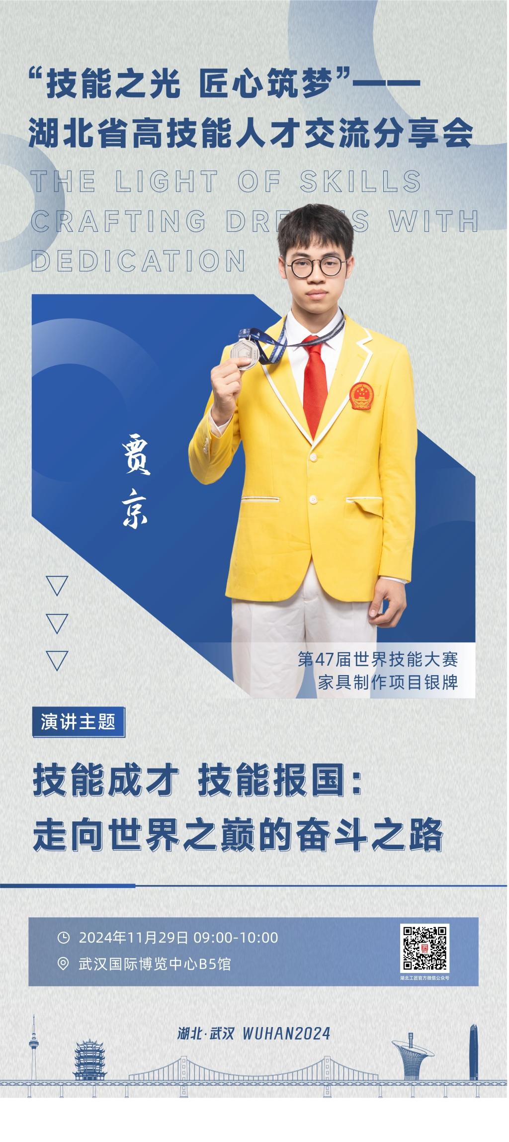 他以独特的设计和精湛的技艺,展现了家具制作领域的无限可能,传递了“技艺即文化,匠心即传承”的理念。贾京是全国第二届职业技能大赛家具制作项目的金牌选手,在第47届世界技能大赛上获得家具制作赛项银牌。