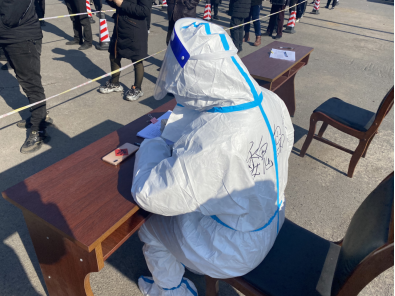 医护人员手中的试管就像琴键一个个精准的放在了格子中,我真的喊累了,坐在离检测点很近的大理石石墩上让快要做核酸的提前出示好身份证和健康码。他们的嗓子也哑了,额前的防护面罩上蒙了一层汗已经冻上了,就维持一个动作不停的一个接着一个。离我最近的检测点暂停了工作,那个穿防护服的医护姐姐悄悄问我厕所怎么走,我给她指了路并帮她脱掉防护服。她说自己穿了两条棉裤但脱防护服的时候腿还是抽筋了,她说实在忍不住了才不得不脱掉防护服,我说我理解因为我成为大白后也已经五六个小时没喝水了,因为怕浪费防疫物资。我从未想过这也是我的经历。临时搭建起的检测点中间有三盏吊着点简易白炽灯,医护人员在影子中工作着,我站在人群中释怀了,谁说站在光里的才算是英雄。疫情当下的至暗时刻,我们每个防疫人员都是逆光的英雄。