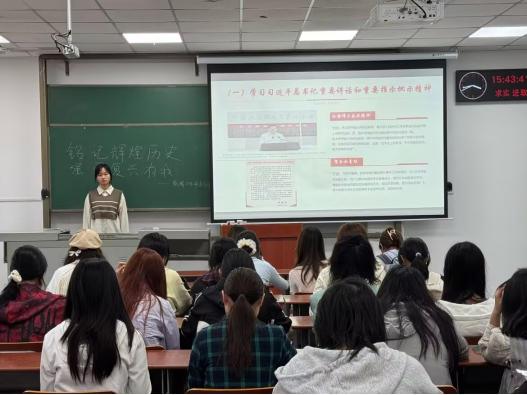 各团支部紧紧围绕习近平总书记重要讲话和重要指示批示精神开展活动。通过专题学习研讨会,重点学习习近平总书记在纪念中国人民抗日战争暨世界反法西斯战争胜利80周年大会上的重要讲话、习近平总书记重要文章《弘扬伟大抗战精神,向着中华民族伟大复兴的光辉彼岸奋勇前进》以及致全国青联十四届全委会和全国学联二十八大的重要贺信精神。随后,各团支部组织红色歌曲传唱、重读抗战家书等活动。庄严肃穆的氛围中,青年学子们深刻缅怀革命先烈的丰功伟绩,切身认识到中国共产党在中华民族伟大复兴征程中的中流砥柱作用。团员们纷纷表示,要坚定不移听党话、跟党走,将“两个确立”和“两个维护”的政治自觉转化为刻苦学习、矢志奋斗的实际行动。