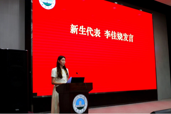 新生代表李佳娆在发言中表示:长大是一个好的平台,在这里你可以成为你想成为的任何人。作为播音与主持艺术32302班的班长,她深刻的认识到了未来四年的担子有多重,要于此间完成自己的规划又是何其不易,但也正如她在发言中所说:大学是人生的黄金时期,敢于尝试是一个青年该有的优秀品质,李佳娆同学的发言深深的感动了在座的每个人,将引领同学们走出初入大学的迷茫!