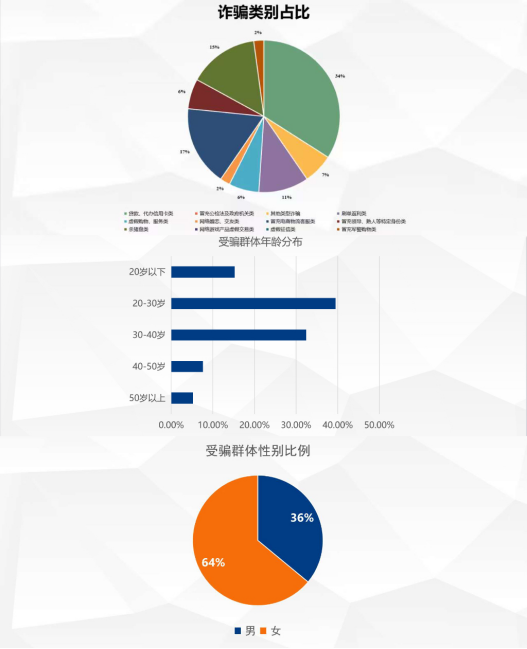 在班会上,各班负责人向同学们介绍电信诈骗的十二种类别和套路,分享一些典型案例,讲解反诈“6431原则”,让同学们切实感受到电信诈骗的危害和影响,并告诉同学们如何提高防骗意识,同学们表示十分受用。广编22203班负责人曹雨妍在班会上向同学们详细分析了诈骗案例的各类占比,如诈骗类别占比、受骗群体年龄分布、受骗群体性别占比等等,以图表的形式直观地表现,让同学们直接地获取信息并知晓相关数据。