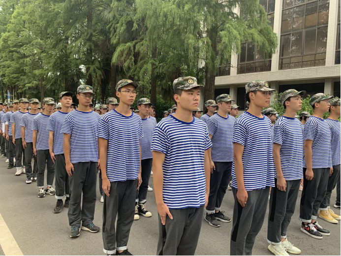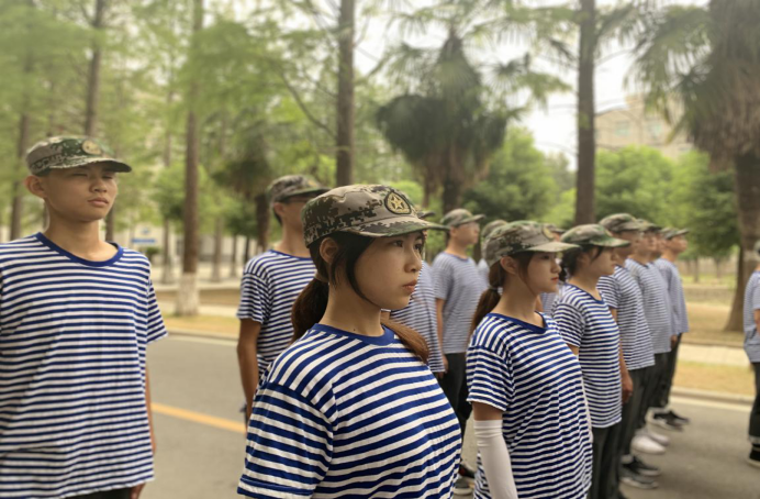 军训伊始,肃容正装;共聚操场,齐沐朝阳;警我新学,坚韧莫忘。