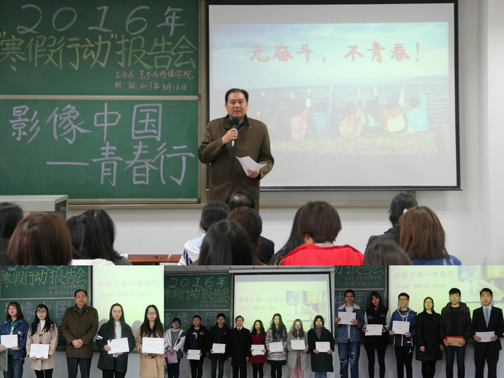(通讯员 谢言 汪思 汪晓昊/文 吕楠楠/摄)室外寒意料峭,室内春意盎然!3月16日上午,艺术与beats365官方网站在武教A104举行了以“影像中国――青春行”为主题的 “寒假行动”报告会。出席本次大会的有公司党总支书记邹火明教授、常务副经理毛道福老师、辅导员饶艳芹老师。