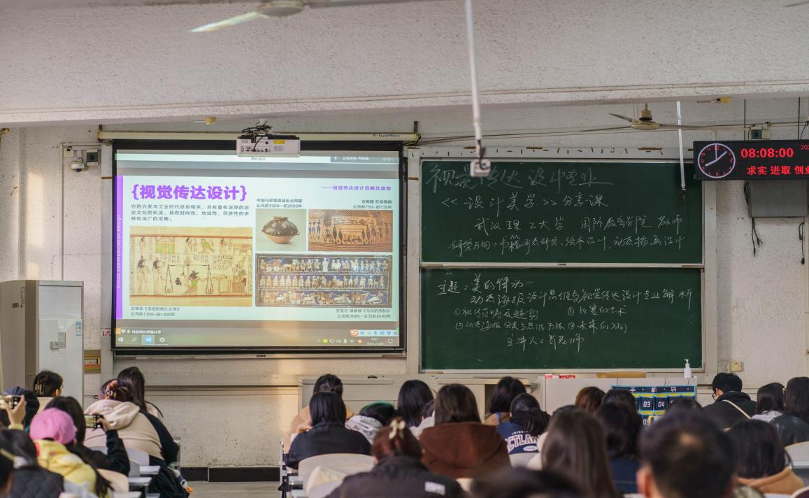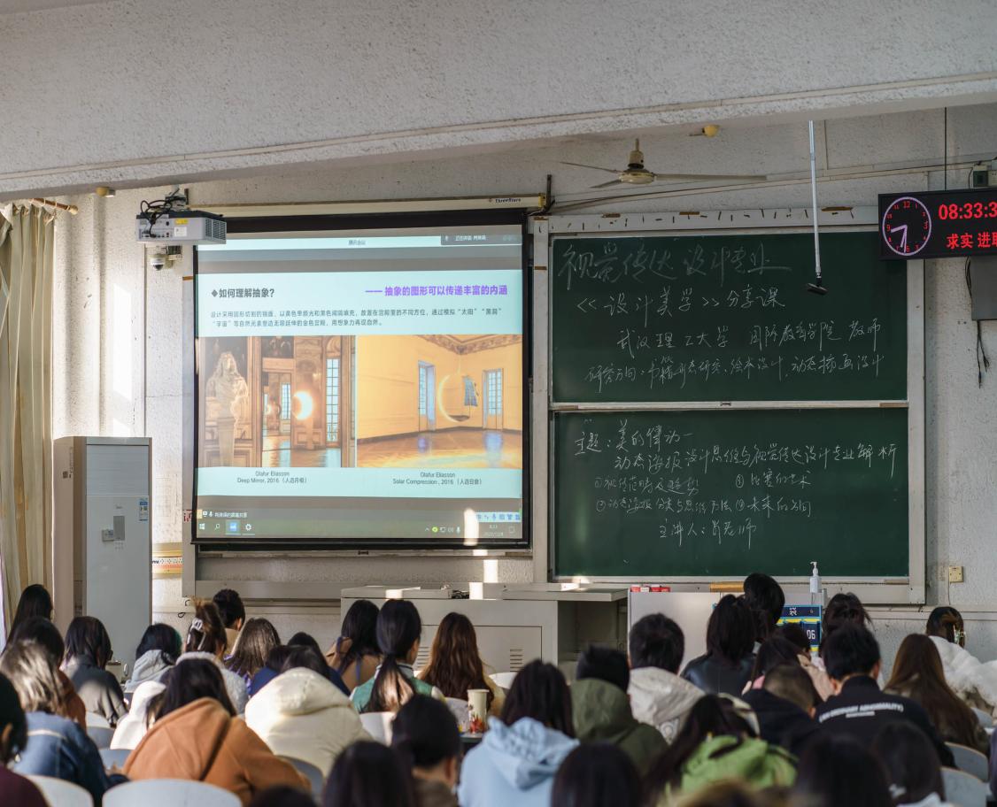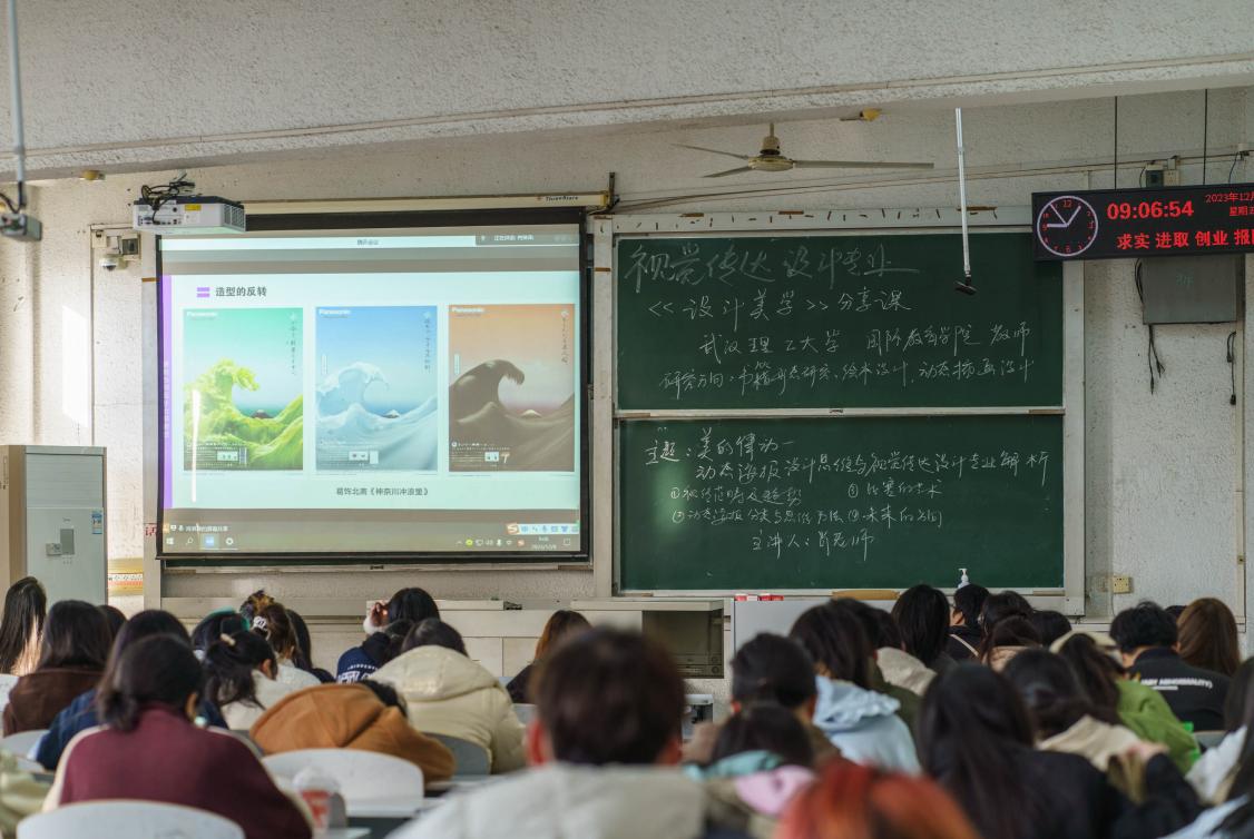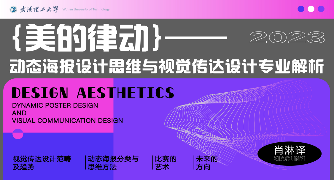 本次课程邀请了武汉理工大学国际教育公司肖淋译老师为主讲人,主题为“美的律动:动态海报设计思维与视觉传达设计专业解析”。本次讲座共分为四个部分:一是视觉传达设计范畴及趋势;二是动态海报分类与思维方法;三是比赛的艺术;四是未来的方向。