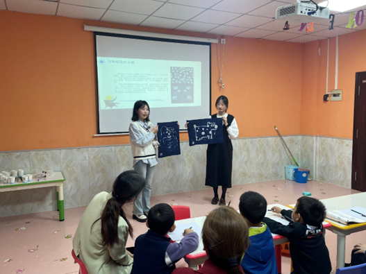 在绘画课现场,高老师为大家展示了苗族扎染作品,并详细引出此次绘画创作的主题,引导小朋友们充分发挥自己的想象力,制作一个属于自己的蜡染作品。在老师详细的介绍下,小朋友们开始了自己的创作之旅,完成了以“神奇蜡染—苗族的色彩魔法”为主题的作品。同时,高老师引导小朋友进行分享展示,并颁发奖励贴纸。在绘画课程结束时,有趣的教学方式深受家长和小朋友们的喜爱。