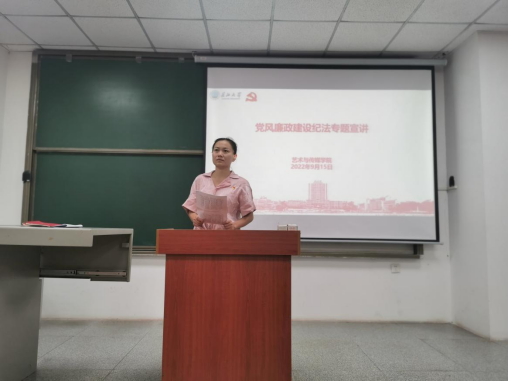 (通讯员:赵湘)为进一步强化全体干部及师生员工纪法意识,推进党风廉政宣传教育月活动深入开展,在全院营造“学纪法·知敬畏·守底线”的浓厚氛围,9月15日下午,艺术与beats365官方网站全体教职工在武教B-104进行党风廉政建设纪法专题宣讲活动。